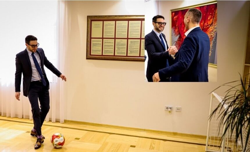 Секако, повторно во центар на внимание беа спортските реквизити од кабинетот на Артан Груби, каде неодамна неговите сопартијци, министрите од ДУИ, играа кошарка и фудбал на мали голчиња. Според фотографиите, Сорос се одлучи за фудбалот.