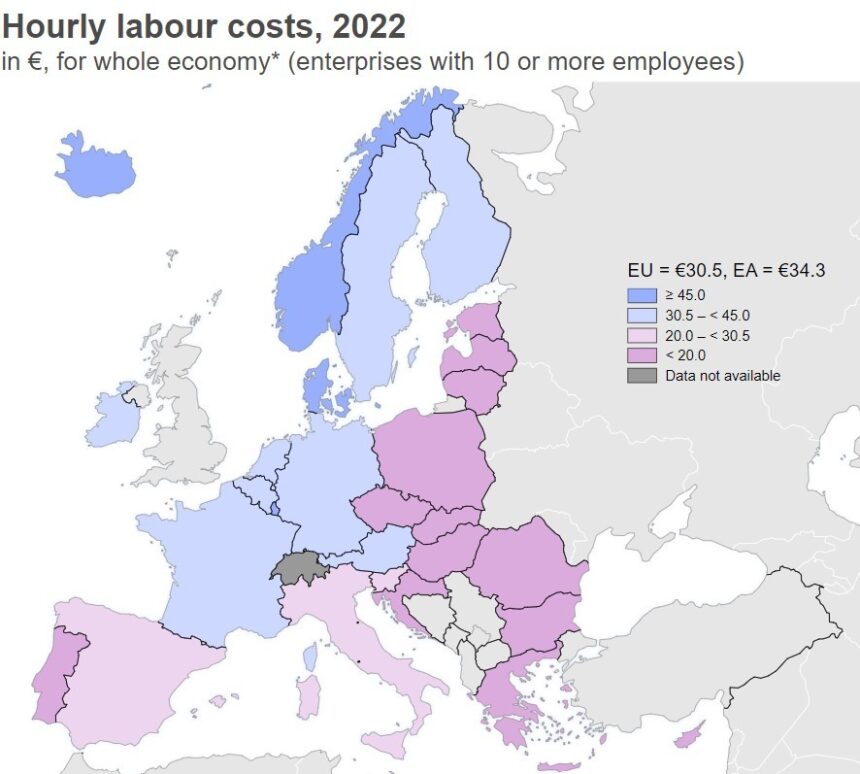Просечните бруто трошоци за вработените во ЕУ за еден работен час во 2022 изнесувале 30,5 евра. Најниски трошоци за работната сила има во Бугарија и Романија, а највисоки во Луксембург.