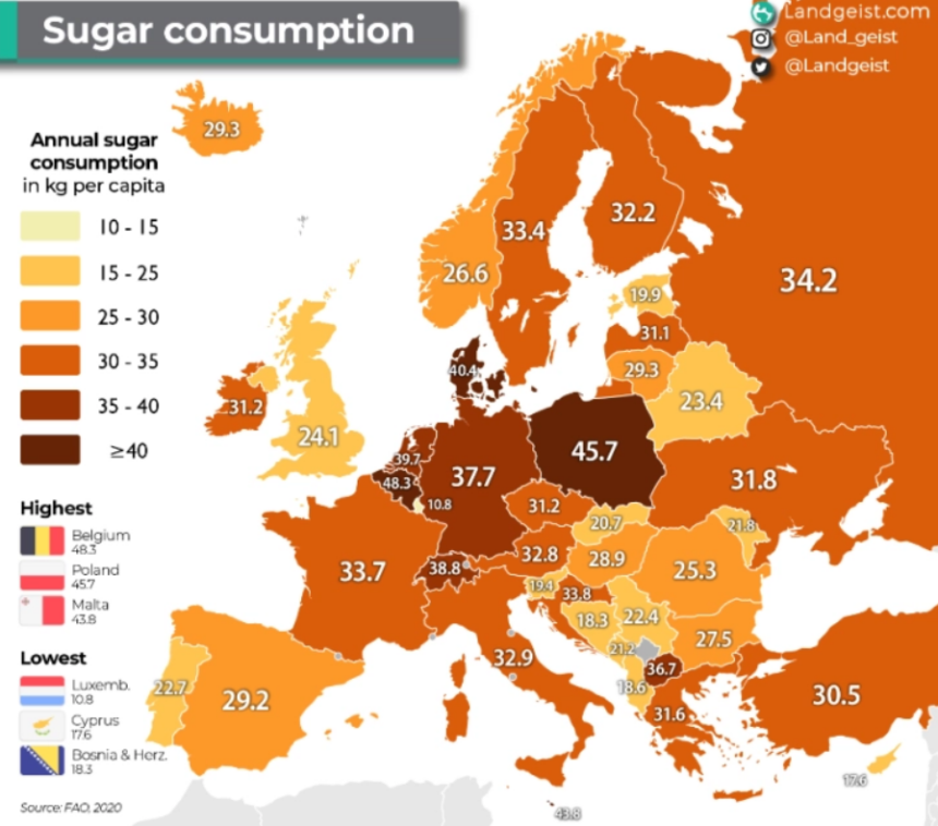 Во Европа најмногу шеќер јадат Белгијците 48,3 и Полјаците 45,7 килограми. Најмалку слатко, пак, се консумира во Луксембург, само 10,8 килограми.