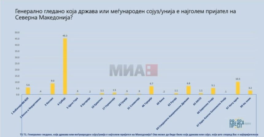 На прашањето генерално гледано, која држава или меѓународен сојуз/унија е најголем пријател на Северна Македонија, по Србија, според анкетата, следна земја најпрепознатлива како пријател е Косово со 9 проценти, САД 6,8, а четврта е Трција со 6,7 отсто. Албанија ја сметаат за пријателска земја 5,6 отсто од испитаниците, ЕУ 5,1 отсто, Германија 1,5, а за НАТО се определиле 1,1 отсто од анкетираните