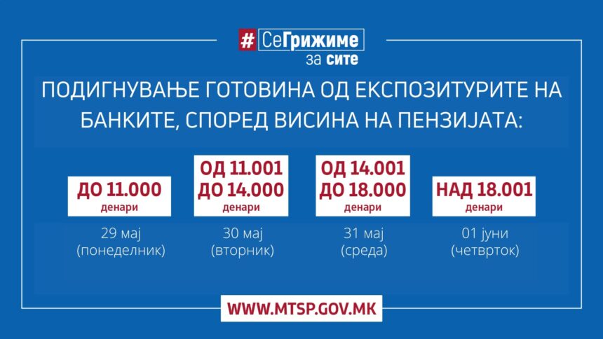 -Подигнувањето на пензиите преку филијалите и експозитурите на банките за пензионерите кои не користат картички ќе се реализира во четири групи, според висината на пензијата. За пензии со висина до 11.000 денари, исплатата да се изврши на 29.05.2023 година (понеделник); за пензии со висина 11.001-14.000 денари, исплатата да се изврши на 30.05.2023 година (вторник); за пензии со висина 14.001-18.000 денари, исплатата да се изврши на 31.05.2023 година (среда) и за пензии со висина над 18.001 денари, исплата да се изврши на 01.06.2023 година (четврток), се наведува во соопштението од МТСП.