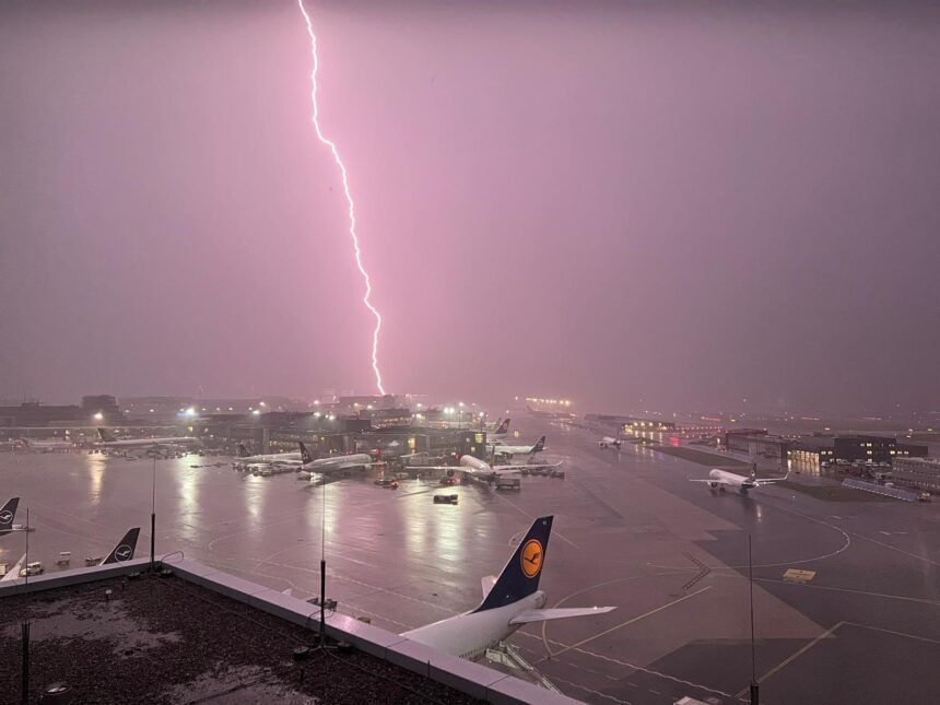 Најмалку 70 летови беа откажани синоќа, откако најголемиот аеродром во Европа, тој во Франкфурт беше буквално под вода. Силното невреме со светкавици и врнежи од дожд ги поплави пистите и авионите, додека во терминалите се појавија мали езерца.