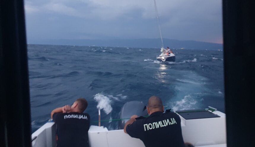 -Постапувајќи по пријава дoбиена околу 19 часот во СВР Охрид дека во водите на Охридското Езеро, сопственик на пловен објект-едрилица, на која покрај него се превезувале уште четири лица, изгубил контрола поради невремето и поради кршење на крмен лист, полициски службеници на Полициската станица за граничен надзор„Охридско Езеро” веднаш излегоа на терен и околу 19.25 часот ја пронајдоа едрилицата на околу 7000 метри од брегот на езерото, во близина на границата со Република Албанија, соопшти МВР.
