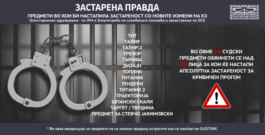 Со донесувањето на измените на Кривичниот законик ќе се овозможи застарување на 14 судски предмети во кои се обвинети над 80 лица, според проценките на Коалицијата „Сите за правично судење“, што ја објави денеска на фејсбук, притоа напоменувајќи дека во оваа евиденција не се земени предвид случаите кои во моментов се наоѓаат во Основното јавно обвинителство за гонење на организиран криминал и корупција (ОЈОГОКК).