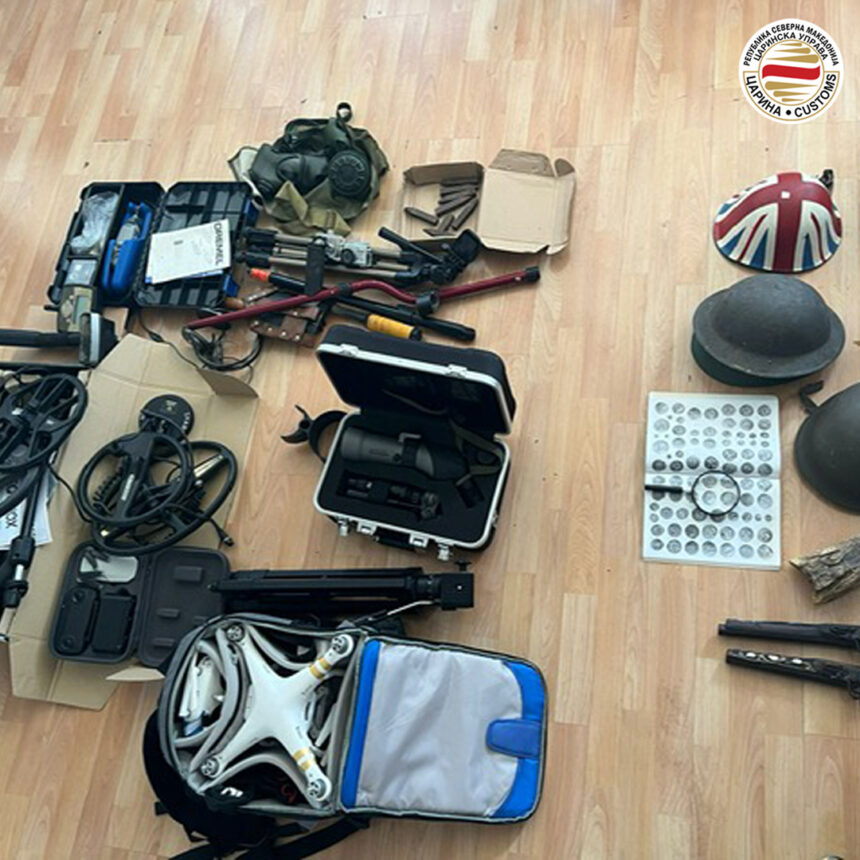 Во возилото во неколку торби и една кутија биле пронајдени три стандардни и еден мал детектор за метал, двоглед, седум војнички шлемови, мини стругалка, два стари револвери – кубури, една аукциска книга, лупа, мини дрон, како и препарирана глава од алигатор.