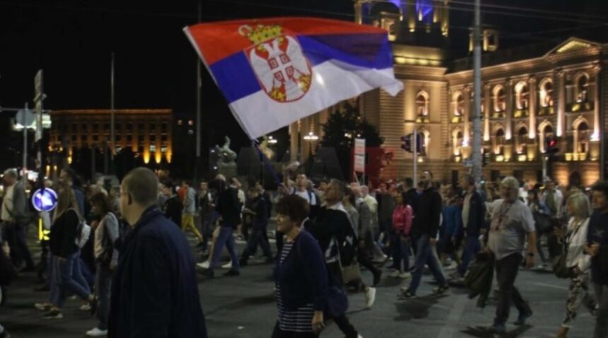 Вечерашниот протест се одвива со блокада на централните белградски улици, долж таканаречената „медиумска рута“ од Народното собрание до зградата на РТС.