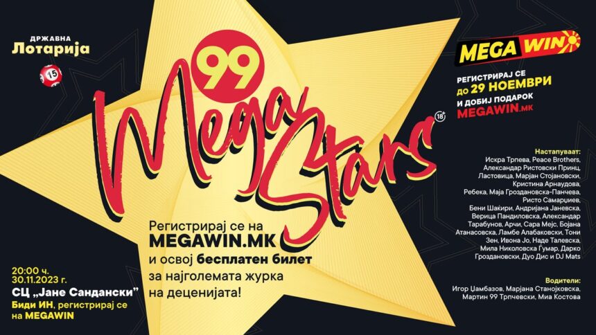 Скопје, 22.11.2023 година − Државна Лотарија, дополнувајќи ги можностите за среќа, забава, подароци, награди и добивки со големо задоволство најавува дека ја отвори за регистрации својата нова веб-страница www.megawin.mk, за онлајн учество во игри на среќа. Во чест на отворањето на www.megawin.mk, Државна лотарија организира наградна игра за сите учесници коишто ќе се регистрираат на www.megawin.mk заклучно со 29 ноември. Страницата ќе биде официјално отворена за игра на 30.11.2023 г., а стартот ќе се одбележи на претстојниот концерт „Мегастарс“, на 30 ноември, од 20:00 часот во СЦ „Јане Сандански“.