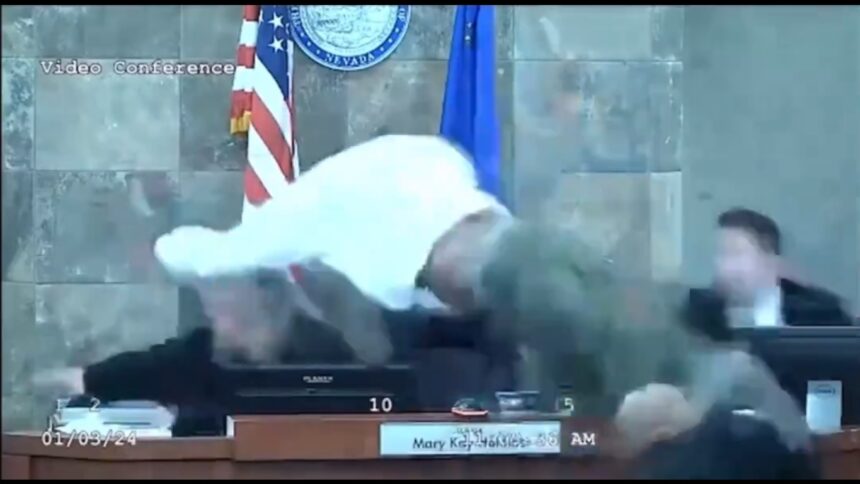 Драматично видео од судница во Лас Вегас, снимено на 3 јануари, покажува како осуден криминалец напаѓа судија за време на сослушувањето и изрекувањето на пресудата. Окружниот судија Кларк Мери Кеј Холтус требало да донесе одлука за затворска казна за Деобра Реден кога тој истрча, прескокна преку маса и ја нападнал, пренесува мондо.рс