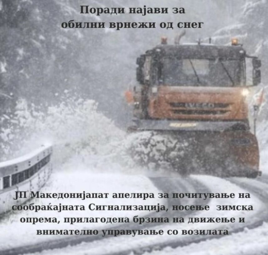 Од јавното претпријатие „Македонијапат“ апелираат до учесниците на сообраќајот да ја почитуваат пропишаната законскa одредба за поседување задолжителна зимска опрема, да користат зимски гуми, да ја прилагодат брзината кон условите на патот, како и да имаат топла облека во своите возила и полни резервоари за гориво.
