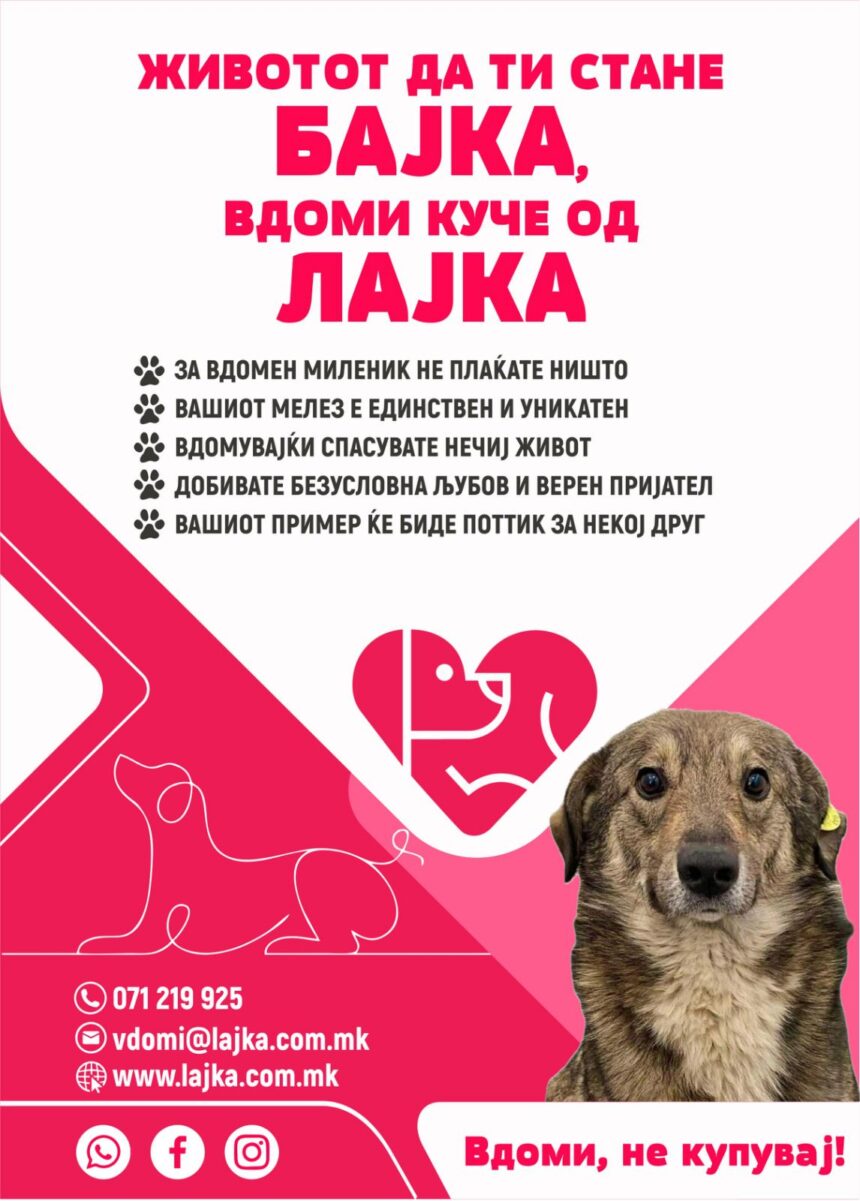 -Животните на улица се осудени на тежок живот, секојдневие исполнето со страв, трауми, глад, предвремена, најчесто насилна смрт. Но, хуманоста е „заразна“, а една позитивна приказна влијае и менува многу. Со вашата одлука вие спасувате еден живот, а притоа давате позитивен пример на сите останати. Благодарение на таквите, сè поголема е бројката на поединци кои вдомиле, ќе вдомат и ќе спасат живот и кои стекнале прекрасен, верен и уникатен пријател, велат од ЈП Лајка.
