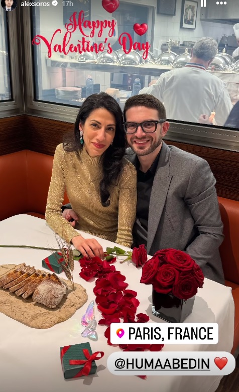 Се црвени рози во Париз, милионерот Алекс Сорос (38), син на филантропот Џорџ Сорос Денот на љубените го прослави со Хума Абедин (47), поранешна сопруга на политичарот Ентони Вајнер, како и долгогодишна соработничка на Хилари Клинтон. Фотографијата од романтичниот состанок, Сорос помладиот, ја објави на Инстаграм.