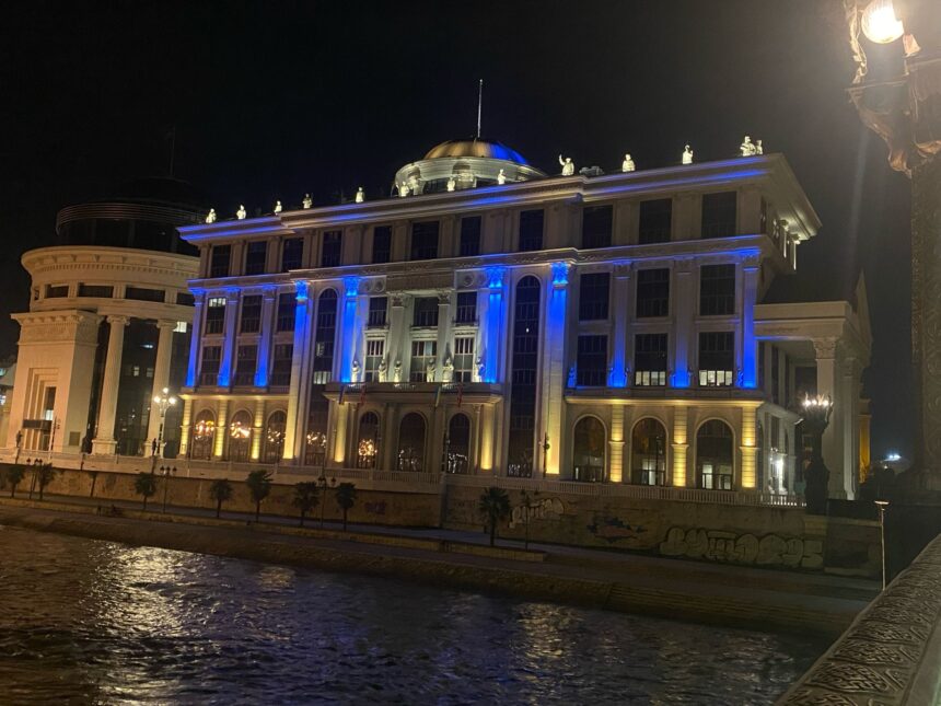 Зградата на Министерството за надворешни работи (МНР) вечерва е осветлена во боите на украинското знаме во пресрет на двегодишнината од руската инвазија на Украина.