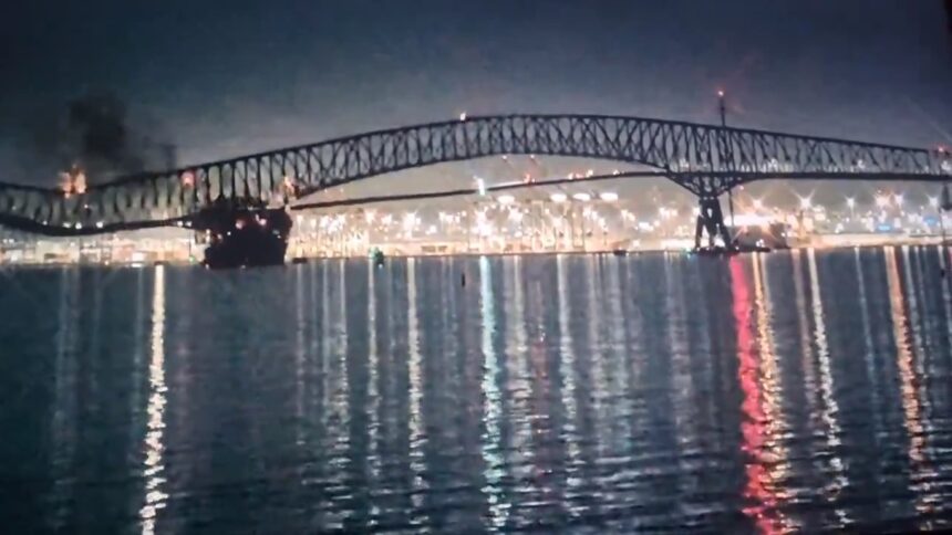 The Francis Scott Key Bridge in Baltimore, Maryland which crosses the Patapsco River has reportedly Collapsed within the last few minutes after being Struck by a Large Container Ship; a Mass Casualty Incident has been Declared with over a Dozen Cars and many Individuals said to… pic.twitter.com/SsPMU8Mjph