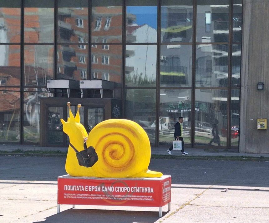 Полжав осамна денеска пред Поштата во Скопје. „Поштата е брза, само споро стигнува“ е мотото на денешната герила акција зад која стои Центарот за современи уметности.