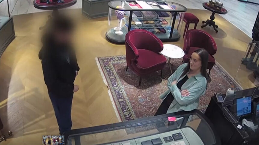 На видеото може да се види наставничката како се смешка додека момчето гледа во каишот, пред Џојнс да плати повеќе од 400 евра со нејзината картичка за да му ја купи.