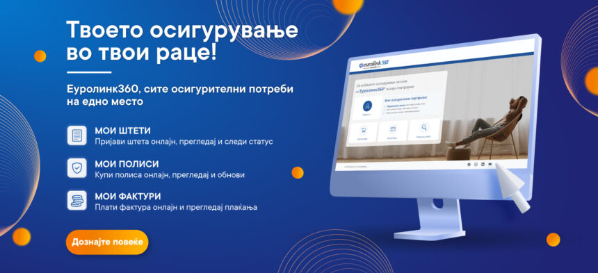 Со задоволство го објавуваме лансирањето на новата онлајн платформа Еуролинк360о, дизајнирана да им овозможи на нашите клиенти целосен увид и безбедно управување со сопственото осигурително портфолио. Оваа современа платформа обезбедува лесно и брзо онлајн пријавување на штети по сите полиси, пратење на статусот на пријавената штета онлајн во реално време, целосен преглед на сите фактури и управување со начините за плаќање, обнова на полиси како и унапредување на функциите што веќе беа достапни за нашите клиенти – усовршен систем за е-плаќање и нов, јасен и брз веб шоп за е-полиси. Сите овие функционалности ги претставуваат сите осигурителни потреби на нашите клиенти – сега достапни на едно место. Оттука произлезе и името на платформата, односно симболиката на 360 степени, што асоцира на целосно заокружено подобрено искуство, во секоја точка од нашите достапни услуги.