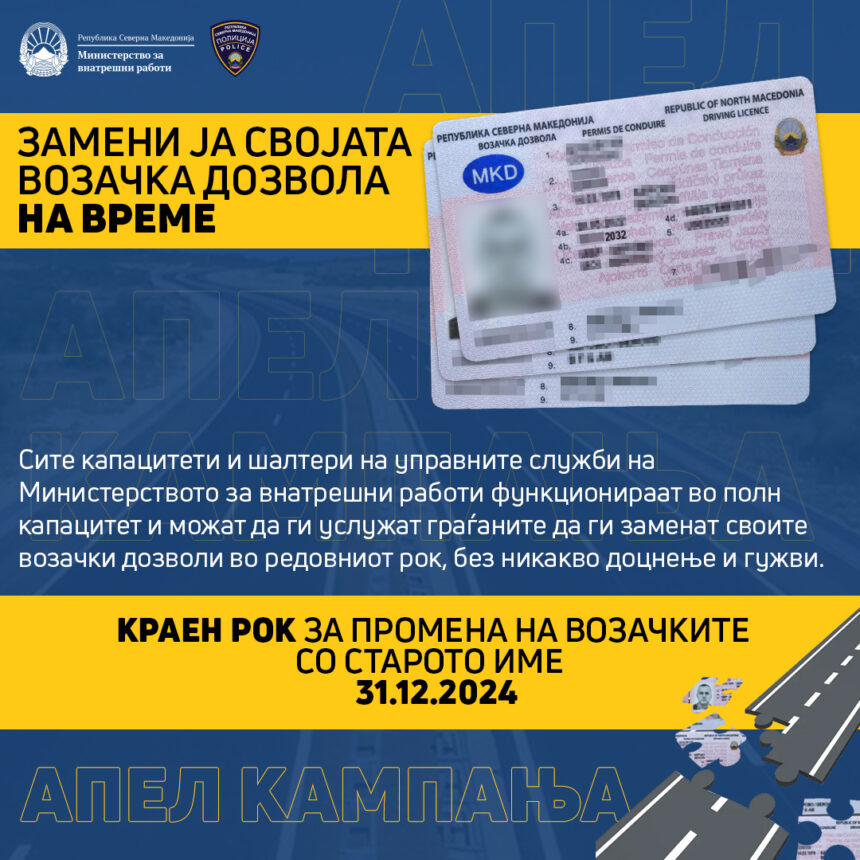 – Сите капацитети на министерството и шалтерите на управните служби функционираат во полн капацитет и можат да ги услужат граѓаните да ги заменат своите возачки дозволи во редовниот рок до 31.12.2024, без никакво доцнење и гужви, соопштија од МВР.