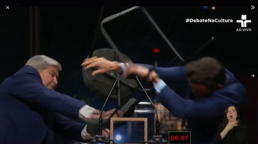 🇧🇷Durante un debate a la alcaldía de Sao Paulo televisado en TV Cultura el día de ayer en la noche, José Luiz Datena, candidato por el PSDB , agredió físicamente con una silla a Pablo Marçal, candidato por el PRTB pic.twitter.com/hhdj6paIgF