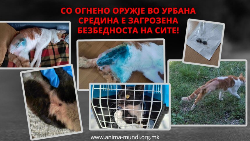 -Еден мачор стрелан кој со последни сили, избезумен се вратил во својот двор, со раскината нога до карлица/колкот која морала да му се ампутира веднаш за да се спаси; другата мачка погодена во гради, распрснат куршум за која е интервенирано веднаш, и која има невидена среќа во несреќа што е жива. Во полициска станица Чаир е пријавено веднаш од страна на сопстениците кои се решени да одат до крај и стрепат за животот на своите животни. Вакво дело може да направи само безумен човек, садист и монструм, кој е неопходно итно да биде идентификуван и затворен, спречен да продолжи и понатаму. Нагласуваме – со ова оружје може да се осакати и убие човек, дете, животно и покрај вакви индивидуи никој жив не е безбеден на улица! Бараме максимална посветеност на МВР, вештачење на куршумите кои се доказ и начин да се истражи и фати сторителот и затвори! Кој од чиста мира злоставува животно е општествена закана, и истото утре ќе го прави и на луѓе, деца, на секој што е послаб од него. Повторуваме, трагата е во остатоците од куршумот зошто за ова оружје е неопходно да се поседува дозвола, информираат од „Анима Мунди“ и додаваат: