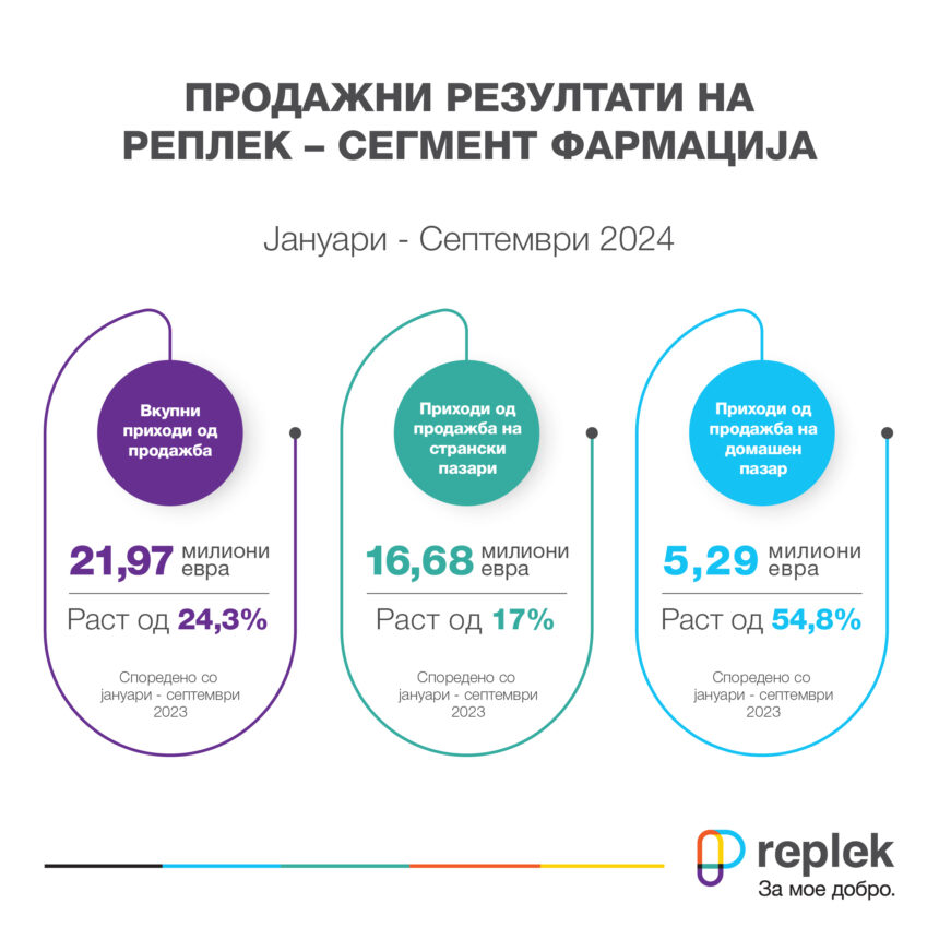 Продолжува нагорниот тренд на остварени приходи од продажба на „Реплек АД“. Во третото тромесечје од оваа година компанијата оствари вкупен раст на приходите од продажба во сегментот фармација од 30,9% во однос на истиот период минатата година.