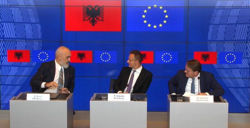 На прес конференцијата по одржувањето на меѓувладината конференција Албанија – ЕУ, новинар од Бугарија праша за статусот на Македонија и за како што рече „одвојувањето на Албанија од Македонија на патот кон ЕУ“.