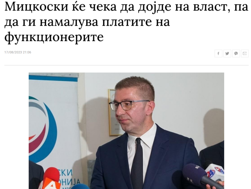 -Мицкоски од време на опозиција не го познава Мицкоски од власта. Во интервју за Сител Телевизија на 17.08.2023 година, Мицкоски ќе вети пред граѓаните дека ќе ги ревидира и ќе ги намали платите на фунционерите доколку граѓаните му да ја дададат довербата, за што ќе предложат и конкретен закон. Еве Мицкоски е премиер, поминаа 4 месеци како ја предводи Владата, нема ниту збор за ветеното намалување и ревизија на платите на функционерите. СДСМ очекува Мицкоски да го исполни ветувањето за намалување и ревизија на платите на функционерите, велат од партијата.