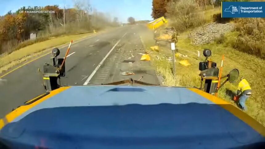 Работник на автопат во САД за влакно ја избегнал смртта кога камион со голема брзина удрил во неговото паркирано возило. Одделот за транспорт на државата Њујорк сподели видео од инцидентот како јасен потсетник за опасностите со кои се соочуваат оние кои ги одржуваат патиштата и како апел до возачите да бидат повнимателни.