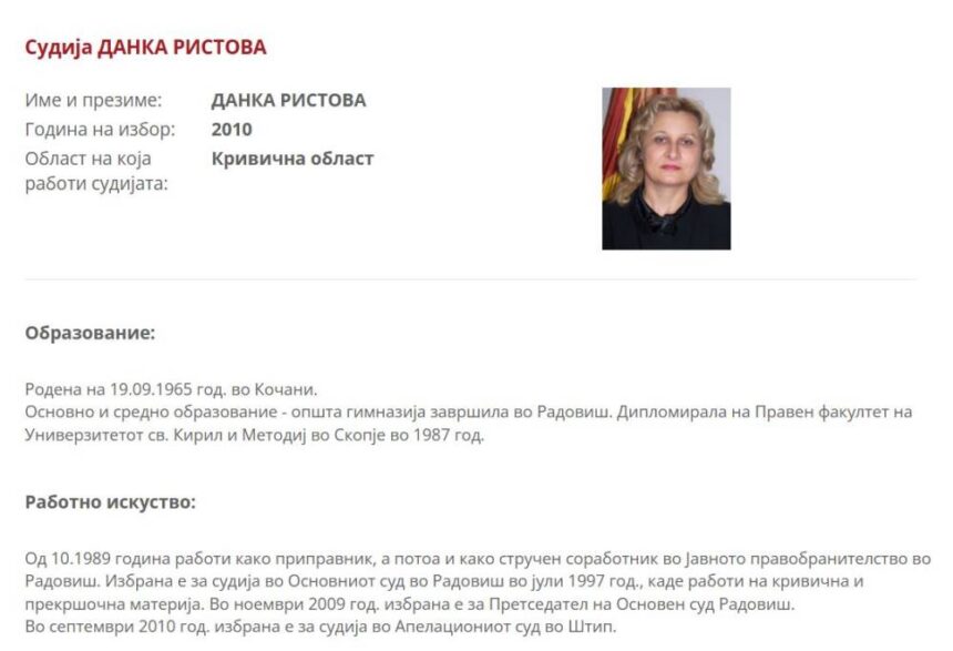 Сопругата на градоначалникот на Радовиш од редовите на ВМРО-ДПМНЕ Ацо Ристов, судијката Данка Ристова е избрана за нов член на Судскиот Совет. Таа ќе замени Лорета Ѓорѓиева чиј мандат истече. Изборот е направен преку гласање од судиите во Штипското апелационо подрачје, каде Ристова добила мнозинство гласови.