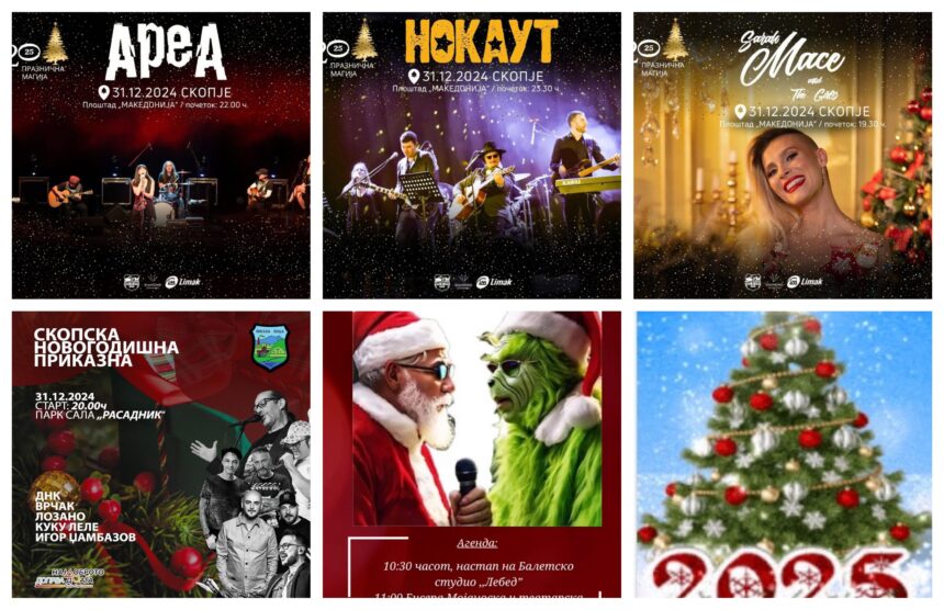 „Празнична магија 2025“ на плоштадот „Македонија“ организира Град Скопје. Новогодишниот концерт ќе почне во 19.30 часот со настап на Сара Мејс. Од 20.30 часот ќе настапи групата „Љубојна“, а потоа и „Ареа“, од 22 часот, и „Нокаут“ од 23.30.