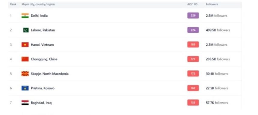 Листата на најзагадени градови ја предводат Делхи во Индија (225), Лахор(224) во Пакистан и Ханој (185) во Виетнам.