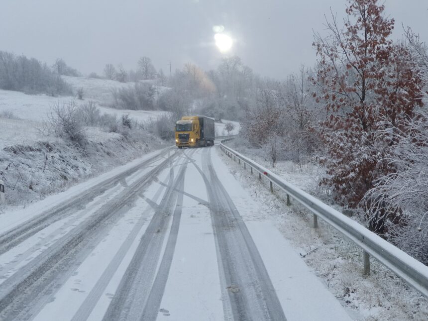 Сообраќајот на државните патишта се одвива во зимски услови по влажни коловози со остатоци од кашест снег на коловозот по интервенцијата на дежурните екипи на ЈП Македонија пат. Врнежи од снег со слаб интензитет се бележат во Кичево, на Пресека и Буково, информира АМСМ