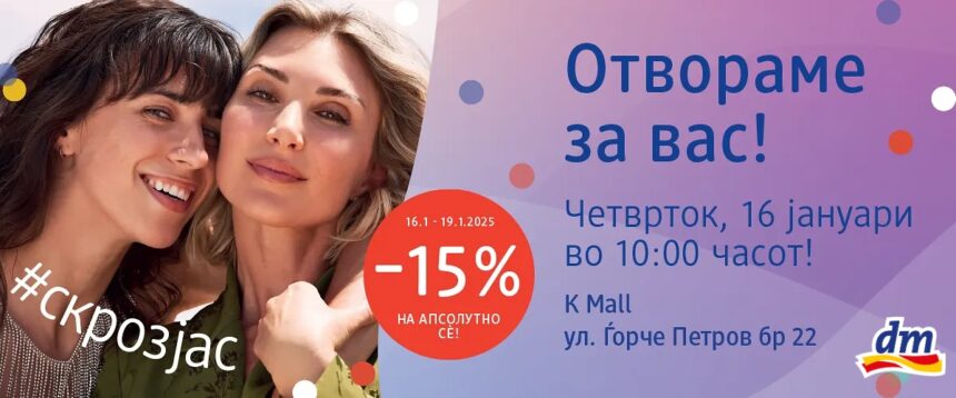 Континуираната експанзија на најголемиот дрогериски ланец во Европа – dm дрогерие маркт продолжува на домашниот пазар. На 16 јануари 2025 година, со почеток од 10 часот, dm ги отвора вратите на својата нова дрогерија во ТЦ ,,K Mall’’.
