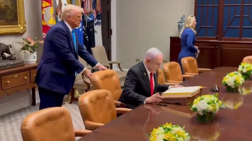 Уште еден детал од средбата Трамп-Нетанјаху привлече внимание на социјалните мрежи. Ова е видео снимено за време на потпишувањето на документите, на кое се гледа како Трамп привлекува стол поблиску додека Нетанјаху седнува.
