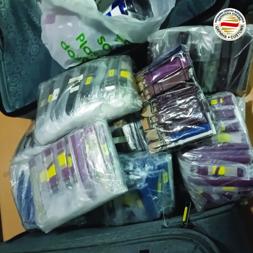 – 1.320 ремчиња за рачни часовници, се пронајдени во два куфери и ранец на македонска државјанка, која патувала со автобус кој сообраќал на релација Истанбул-Скопје. Непријавените производи се откриени при контрола на автобусот на влез во државата на граничниот премин Деве Баир.