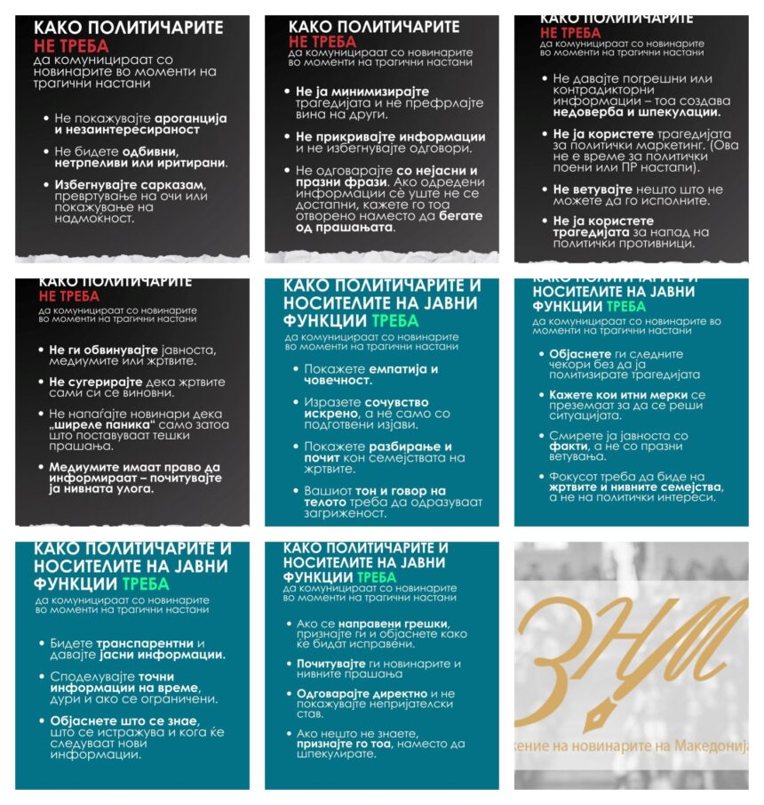 Здружението на новинарите на Македонија (ЗНМ) објави препораки за унапредување на комуникацијата на политичарите и носителите на јавни функции во услови на трагични настани кои ја засегаат целата јавност. Целта е да се зајакне транспарентноста и да се овозможи навремен и коректен пристап до информации.