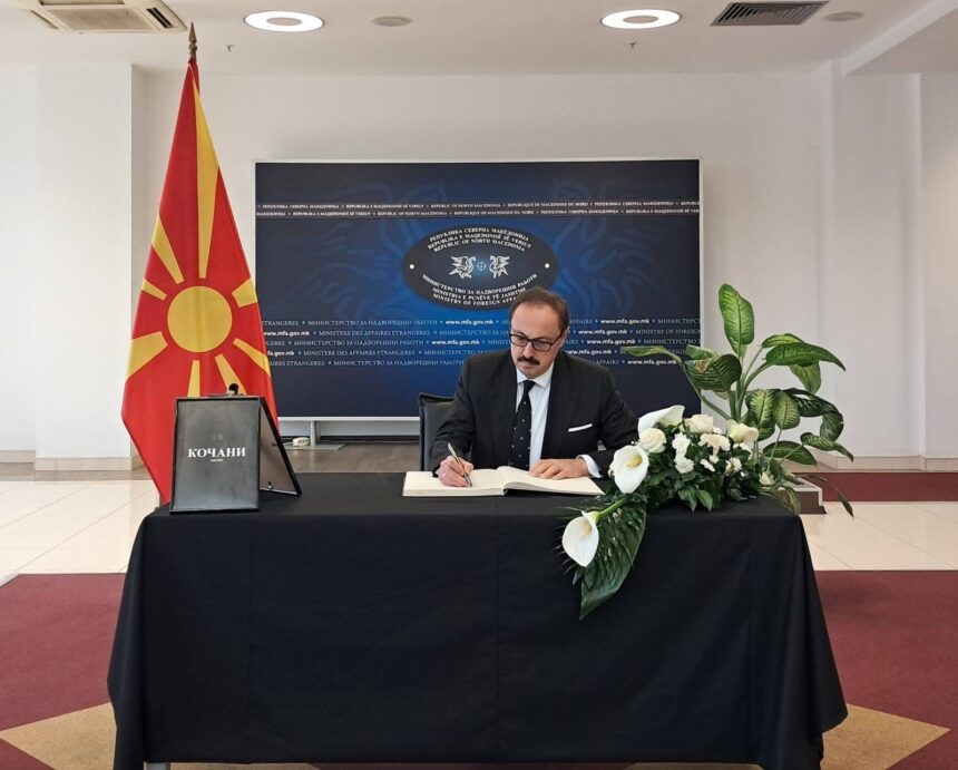 Амбасадорот на Република Туркије Н.Е. Фатих Улусој вчера (17.03.2025) ја потпиша книгата на жалост отворена во Министерството за надворешни работи и надворешна трговија на Република Северна Македонија за лицата кои ги загубија своите животи за време на пожарот во Кочани, информираат од Амбасадата.