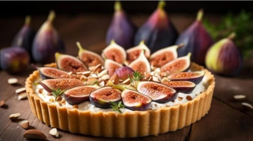 За основата од трошки, измешајте го брашното, бадемите, шеќерот, ванилиниот шеќер и солта во сад. Додадете го ладниот путер исечен на парчиња и брзо втријте го во брашното со прстите за да добиете трошлива смеса. Измешајте го јајцето и месете со раце додека не добиете цврсто тесто. Обликувајте го во топка, завиткајте го во фолија и оставете го во фрижидер 30 минути. Расукајте го изладеното тесто на лист хартија за печење, внимателно префрлете го во кружен калап за пита (со дијаметар од 28 – 30 см) и печете го во рерна претходно загреана на 180 °C околу 30 минути или додека не добие убаво златно-кафеава боја. Извадете ја печената основа од рерна и оставете ја целосно да се излади, потоа внимателно извадете ја од калапот и префрлете ја на чинија за сервирање.За кремот, измешајте го млекото и ванилата во сад за мешање. Изблендирајте сè со миксер додека не добиете цврст крем. За филот, измешајте го џемот од смокви со румот и загрејте го лесно за да се растопи. Измијте ги смоквите и исечете ги на четвртини. Намачкајте две лажици џем од рум врз изладената пита. Прелијте го подготвениот крем од ванила врз џемот, а потоа уредно наредете ги четвртините од смокви одозгора. Намачкајте го преостанатиот џем врз смоквите и наросете со сечкани бадеми.
