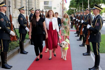(Видео) Прва слепа британска амбасадорка во Љубљана, ќе и помага кучето Ото