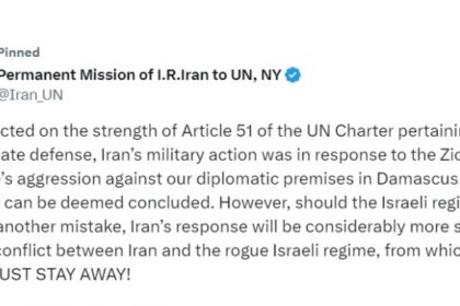 Иранската мисија во ОН соопшти дека нападот врз Израел како одговор на нападот на конзулатот во Дамаск е завршен