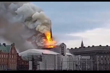(Видео) Пожар ја голта најпознатата зграда во Копенгахен, се урна врвот
