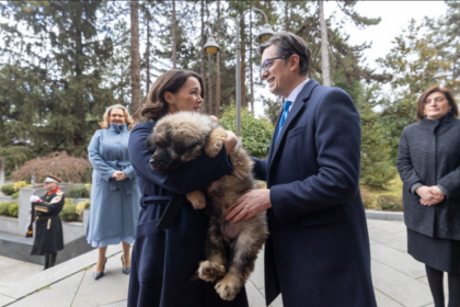 Претседателот Пендаровски при приемот на унгарската претседателка Каталин Новак и подаде кученце…