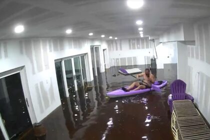 (Видео) Со весла со кајак по поплавена дневна, се спасува од ураганот Хелена
