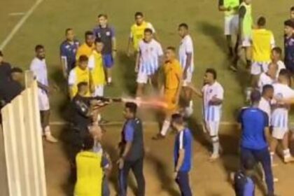 (Видео) Фудбалерите останаа во шок, полицаец со пушка пукаше во голман
